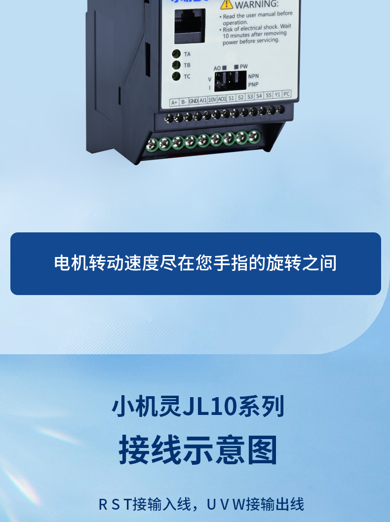 JL10變頻器新品上市,處處是升級,產品身材更小,正面觀看和一部普通智能手機的大小相似。產品雖小,功能齊全。多功能端子接口可聯(lián)機/可聯(lián)網(wǎng),產品外殼采用阻燃材料,耐高溫。
