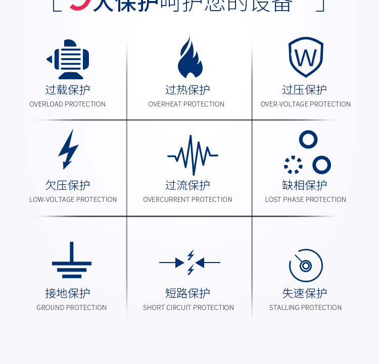 ⊙提供多種故障保護(hù)功能:過流、過壓、欠壓、過溫、缺相、過載等保護(hù)功能