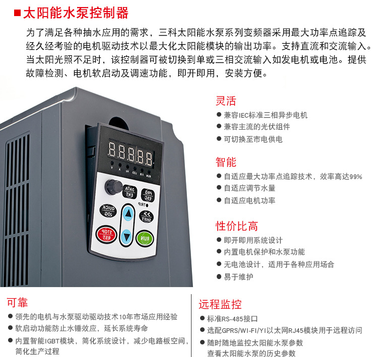 SK650系列變頻器是三科推出的針對光伏發(fā)電,驅(qū)動(dòng)三相交流水泵的變頻器,它采用大功率點(diǎn)追蹤及久經(jīng)考驗(yàn)的電機(jī)驅(qū)動(dòng)技術(shù)以催化增大太陽能模塊的輸出功率,它將直流電直接逆變成三相交流電,可驅(qū)動(dòng)各類交流水泵。同時(shí)它支持直流和交流輸入,當(dāng)沒有太陽能時(shí),該變頻器手動(dòng)切換到單項(xiàng)或三相交流電輸入,如市電發(fā)電機(jī)或電池。SK650光伏水泵變頻器提供全方位保護(hù),電機(jī)軟啟動(dòng)及調(diào)速功能,即開即用,安裝方便。