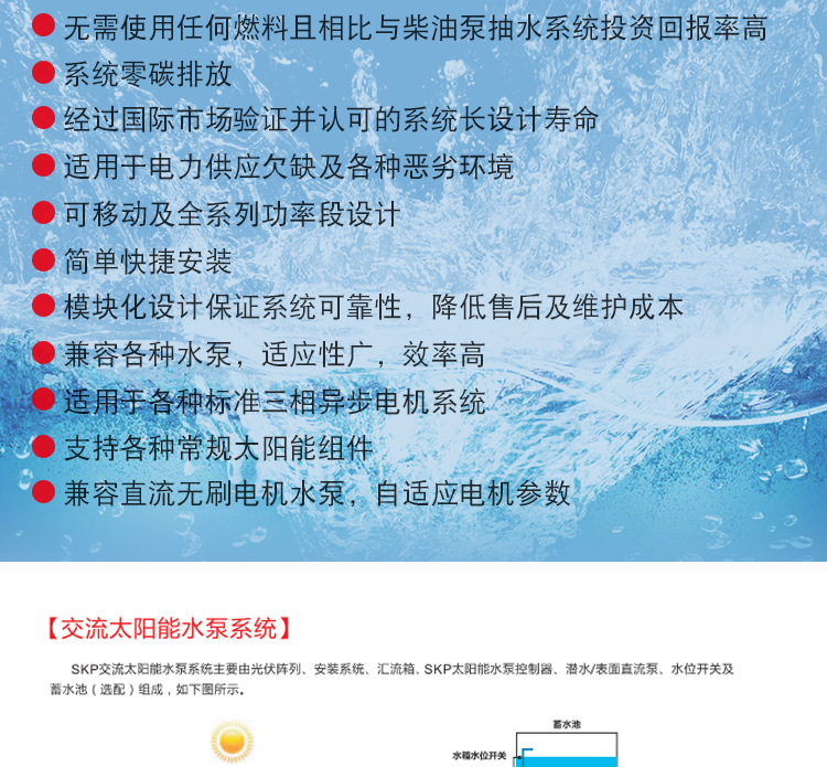 SK650系列變頻器是三科推出的針對光伏發(fā)電,驅(qū)動三相交流水泵的變頻器,它采用大功率點追蹤及久經(jīng)考驗的電機驅(qū)動技術(shù)以催化增大太陽能模塊的輸出功率,它將直流電直接逆變成三相交流電,可驅(qū)動各類交流水泵。同時它支持直流和交流輸入,當(dāng)沒有太陽能時,該變頻器手動切換到單項或三相交流電輸入,如市電發(fā)電機或電池。SK650光伏水泵變頻器提供全方位保護,電機軟啟動及調(diào)速功能,即開即用,安裝方便。| 產(chǎn)品型號 | SKI650A075G-090G-4 | SKI650A090G-110G-4 | SKI650A110G-132G-4 |