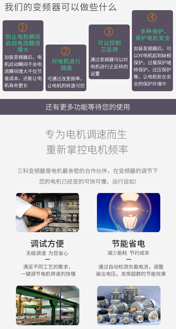三科變頻器技術(shù)領(lǐng)先,環(huán)保節(jié)能,廣泛應(yīng)用在風(fēng)機(jī)、水泵、空壓機(jī)、注塑機(jī)、卷繞機(jī)、中央空調(diào),紡織機(jī)、化工、冶金、礦業(yè)、制藥、陶瓷、造紙、油田、塑料、印刷、熱電、煙草、食品等各類工業(yè)機(jī)械設(shè)備中。