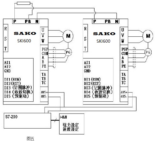 該卷染機的控制系統(tǒng)以三科變頻器作為控制器,采用觸摸屏作為人機界面,它們主要完成的是張力,線速度的設(shè)定,布的厚度的測量以及相關(guān)邏輯動作的控制。變頻器和PLC之間采用485通訊。采用通訊方式的好處是可以隨時知道變頻器主要變量的信息,減少接線,使得整個系統(tǒng)看起來很精簡。接線示意可見上圖。由圖中可見:兩臺完全一樣的變頻器,它們均工作于閉環(huán)矢量控制模式,由于卷染機在接近滿卷時候會較長時間工作在很低的頻率下(1~3Hz),采用較高線數(shù)的編碼器有助于提高在低轉(zhuǎn)速工況下的控制性能,同時考慮散熱,需要采用變頻專用電機。