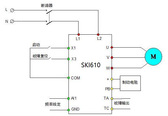 AI1/GND接受控制器輸出的0~10V模擬量信號,此電壓值與變頻器里參數(shù)設(shè)置的調(diào)速頻率范圍對應(yīng)成正比。X1/COM為變頻器正轉(zhuǎn)信號,當(dāng)控制器發(fā)出正轉(zhuǎn)信號,則控制器上的輸出繼電器動(dòng)作,繼電器的常開觸點(diǎn)吸合,提供信號給變頻器。L1、L2為變頻器的電源輸入,若變頻器選擇三相輸入,則連接在R、S、T端子上即可。TA/TC為變頻器繼電器輸出,通常選擇變頻器故障報(bào)警輸出,接入雕刻機(jī)控制器或者外部故障指示回路。