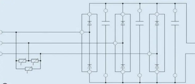 1.整流器/變流器:VFD主電源電路的三個(gè)主要部分之一,是功率流的第一部分。輸入交流線電壓在轉(zhuǎn)換器部分被整流為DC電壓,轉(zhuǎn)換器部分由二極管、可控硅整流器(S . C . R)或絕緣柵雙極晶體管(IGBT)以全波橋式結(jié)構(gòu)連接而成。