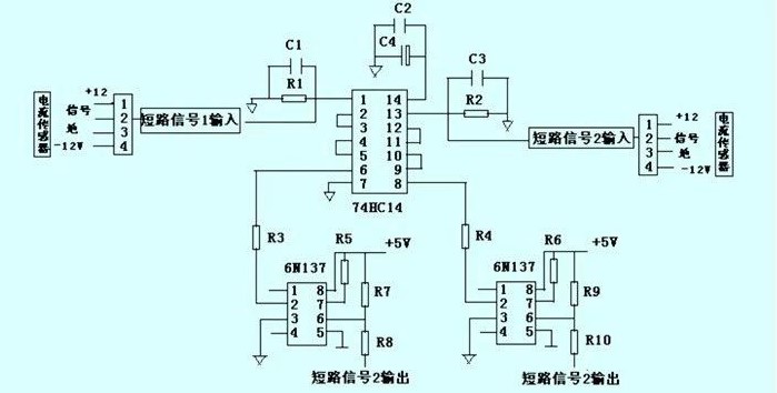 (5)檢查短路保護(hù)板。拔下輸入短路保護(hù)采樣電流傳感器,測量板上電源電壓,12v正常,但+5v電源電壓+3.0v,將集成塊拔成74hc14,+5v正常,說明集成塊已經(jīng)損壞。用新的替換它。