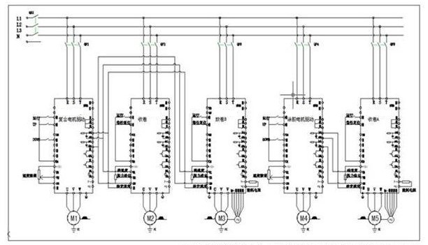 目前行業(yè)常用的方案:卷繞張力由磁粉離合器或力矩電機控制,第一、二次放卷張力由磁粉制動器控制。烘爐段的張力控制主要是通過浮動輥電位器檢測速度偏差,通過電位器或通過同步控制板手動調(diào)節(jié)復(fù)合電機和涂膠電機的速度同步來維持恒定的張力。